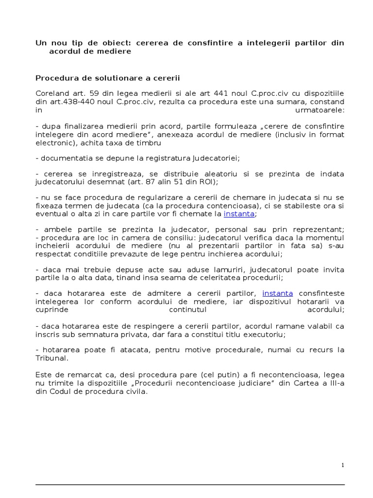 Cererea De Consfintire A Intelegerii Partilor Din Acordul De Mediere1